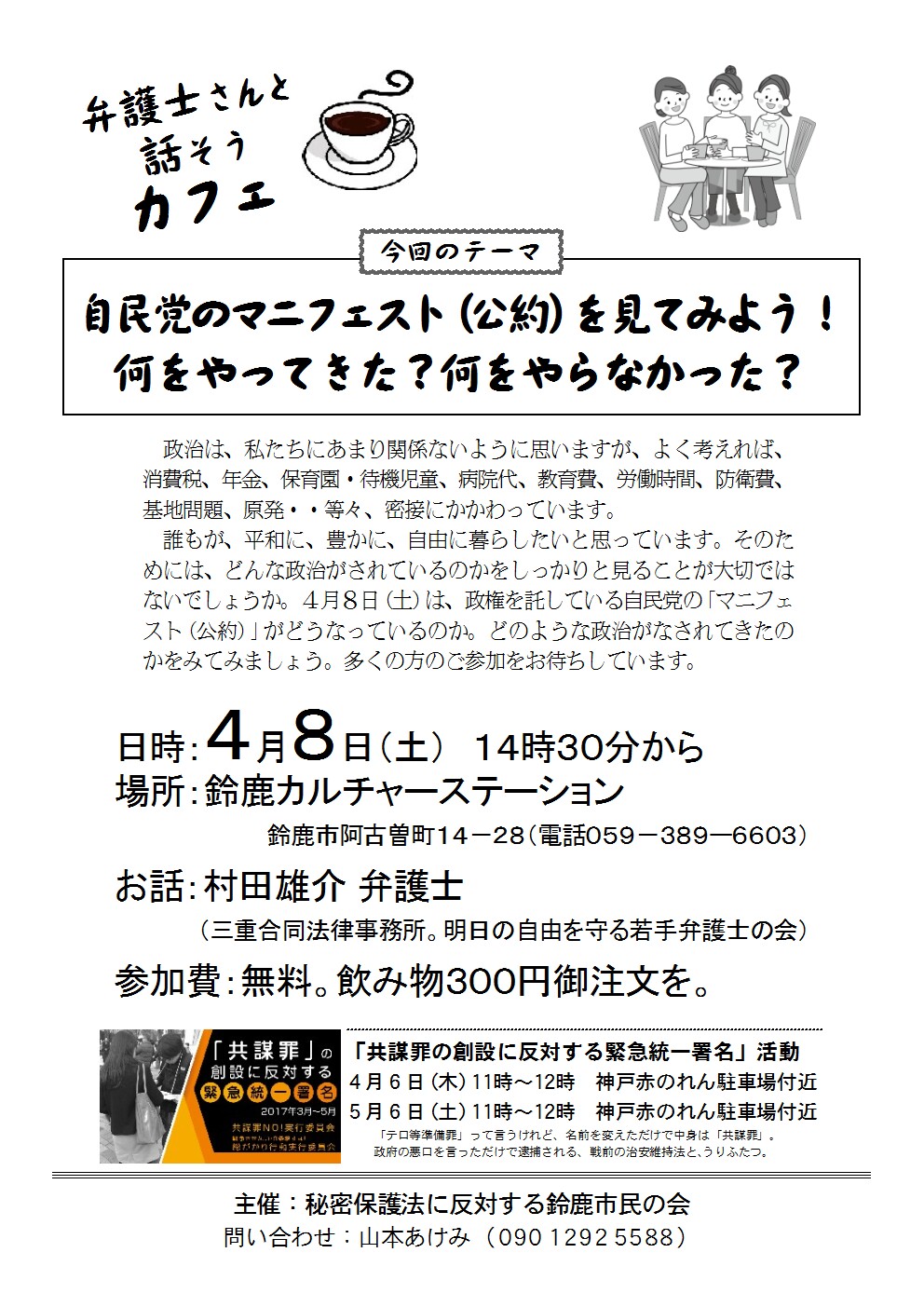 2017年4月活動のご案内 ■署名活動 「共謀罪の創設に反対する緊急統一署名」活動 4月6日(木)11時~12時 神戸赤のれん駐車場付近 5月6日(土)11時~12時 神戸赤のれん駐車場付近 「テロ等準備罪」って言うけれど、名前を変えただけで中身は「共謀罪」。政府の悪口を言っただけで逮捕される、戦前の治安維持法と、うりふたつ。 ■弁護士さんと話そうカフェ <今回のテーマ> 「自民党のマニフェスト(公約)を見てみよう! 何をやってきた?何をやらなかった?」 日時:4月8日(土)14時30分から 場所:鈴鹿カルチャーステーション 鈴鹿市阿古曽町14-28(電話059-389ー6603) お話:村田雄介 弁護士 (三重合同法律事務所。明日の自由を守る若手弁護士の会) 参加費:無料。飲み物300円御注文を。 政治は、私たちにあまり関係ないように思いますが、よく考えれば、消費税、年金、保育園・待機児童、病院代、教育費、労働時間、防衛費、基地問題、原発・・等々、密接にかかわっています。 誰もが、平和に、豊かに、自由に暮らしたいと思っています。そのためには、どんな政治がされているのかをしっかりと見ることが大切ではないでしょうか。政権を託している自民党の「マニフェスト(公約)」がどうなっているのか。どのような政治がなされてきたのかをみてみましょう。多くの方のご参加をお待ちしています。 主催:秘密保護法に反対する鈴鹿市民の会 問い合わせ:山本あけみ(090 1292 5588