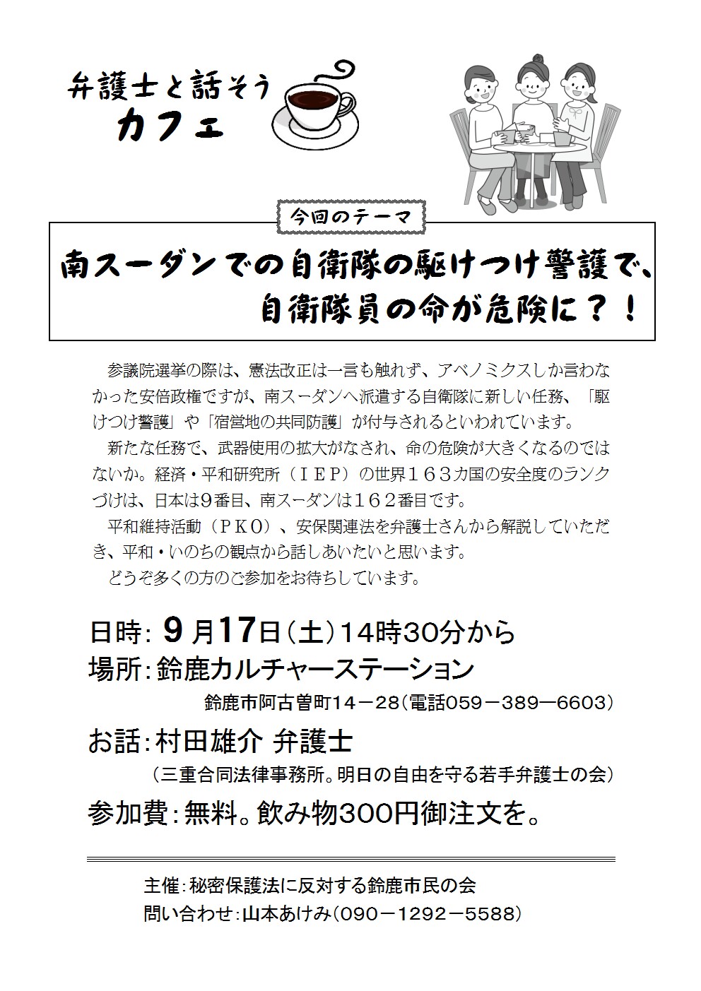 2016年9月活動のご案内 ■弁護士と話そうカフェ <今回のテーマ> 南スーダンでの自衛隊の駆けつけ警護で、自衛隊員の命が危険に?! 日時:9月17日(土)14時30分から 場所:鈴鹿カルチャーステーション 鈴鹿市阿古曽町14-28(電話059-389ー6603) お話:村田雄介 弁護士 (三重合同法律事務所。明日の自由を守る若手弁護士の会) 参加費:無料。飲み物300円御注文を。 参議院選挙の際は、憲法改正は一言も触れず、アベノミクスしか言わなかった安倍政権ですが、南スーダンへ派遣する自衛隊に新しい任務、「駆けつけ警護」や「宿営地の共同防護」が付与されるといわれています。 新たな任務で、武器使用の拡大がなされ、命の危険が大きくなるのではないか。経済・平和研究所(IEP)の世界163カ国の安全度のランクづけは、日本は9番目、南スーダンは162番目です。 平和維持活動(PKO)、安保関連法を弁護士さんから解説していただき、平和・いのちの観点から話しあいたいと思います。 どうぞ多くの方のご参加をお待ちしています。 主催:秘密保護法に反対する鈴鹿市民の会 問い合わせ:山本あけみ(090-1292-5588)