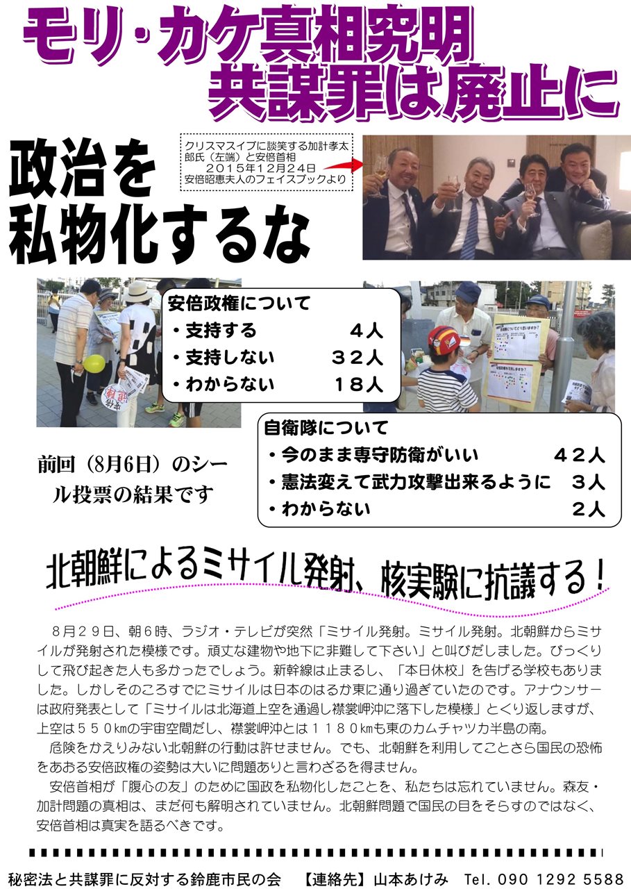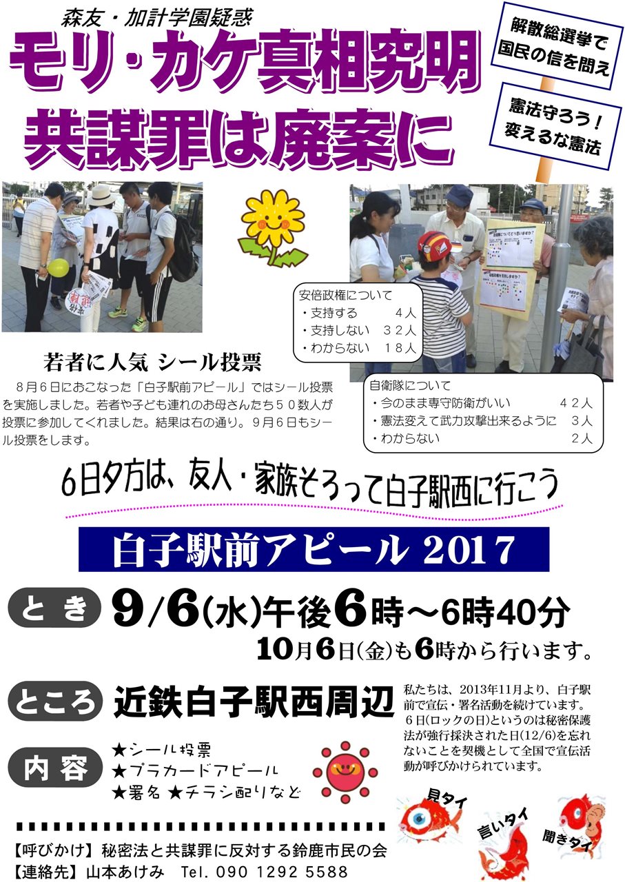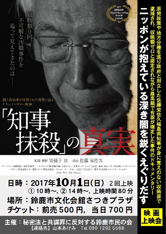 2017年9月活動のご案内 ■宣伝活動・毎月6日行動 日時:9月6日(水)18時~40分間 場所:近鉄白子駅西口周辺 内容:スタンディング、チラシ配り、シール投票、署名など検討中 中日新聞「鈴鹿亀山版」2017-9-6 ■10月 映画会予定 ~ニッポンが抱えている深き闇を鋭くえぐりだす~ 映画「知事抹殺の真実」 http://eisaku-movie.jp/ 日時:10月1日(日)10時~、14時~ 場所:鈴鹿市文化会館さつきプラザ チケット:前売500円、当日700円 ※原発政策や地方分権を巡り政府と対立した佐藤栄佐久福島県知事が身に覚えのない収賄罪で逮捕され、収賄額ゼロと認定されながら最高裁で有罪が確定した事件のドキュメンタリー映画。