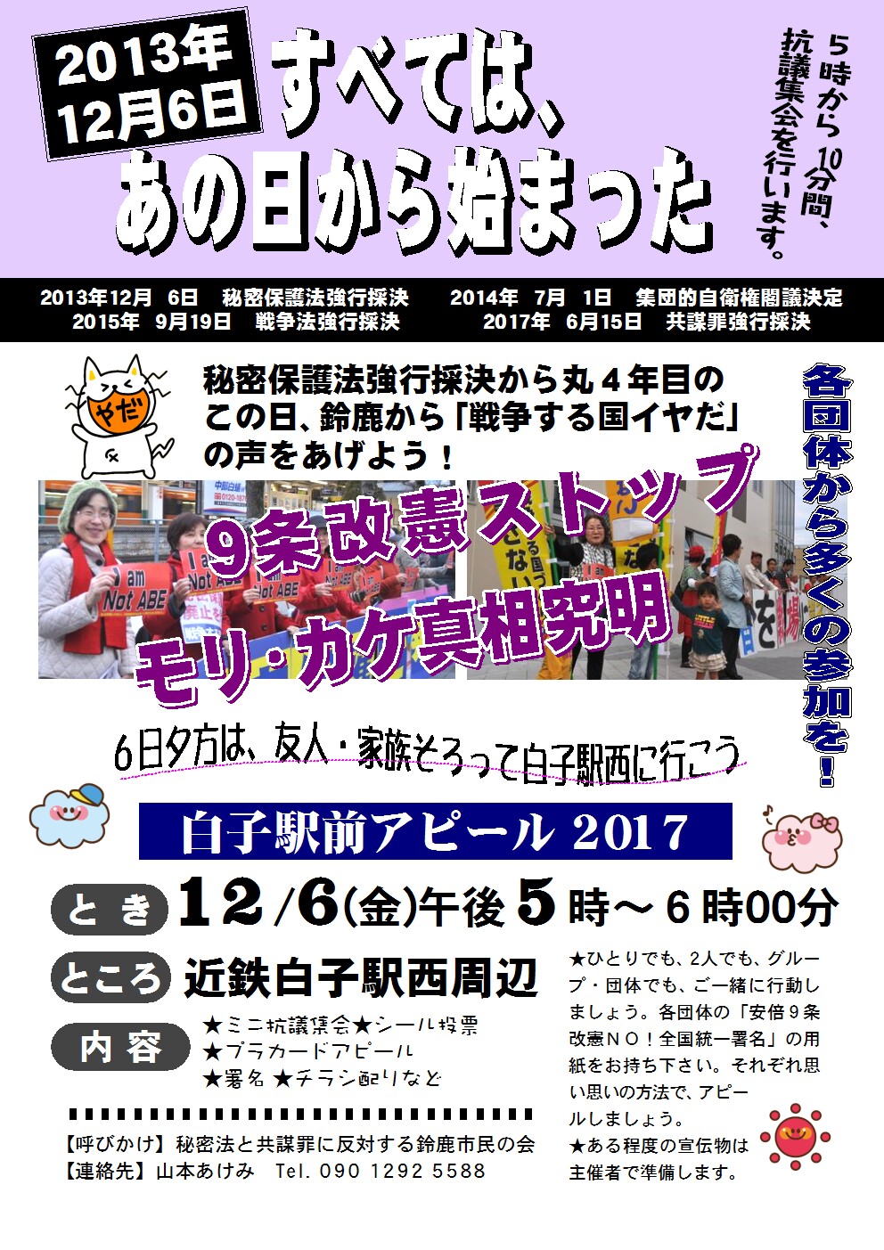 12月活動のご案内 ■弁護士さんと話そうカフェ <今回のテーマ>「増大する防衛費の意味とは?憲法改正が庶民の生活にどう影響するの?!」 日時:12月16日(土)14時から 場所:鈴鹿カルチャーステーション 鈴鹿市阿古曽町14-28 お話:村田雄介 弁護士 (三重合同法律事務所。明日の自由を守る若手弁護士の会) 参加費:無料。飲み物300円御注文を。 ■12月6日(水)午後5時、近鉄白子駅西へ 2013年12月6日、秘密保護法強行採決!すべては、この日から始まった。 2014年 7月 1日 集団的自衛権閣議決定 2015年 9月19日 戦争法強行採決 2017年 6月15日 共謀罪強行採決 秘密保護法強行採決から丸4年目のこの日、 鈴鹿から「戦争する国イヤだ」の声をあげよう! 「9条改憲ストップ!モリ・カケ真相究明」 白子駅前アピール 2017 日時:12月6日(水)午後5時~6時00分 場所:近鉄白子駅西周辺 内容:★ミニ抗議集会★シール投票 ★プラカードアピール ★署名 ★チラシ配りなど ※5時から10分間、抗議集会を行います。