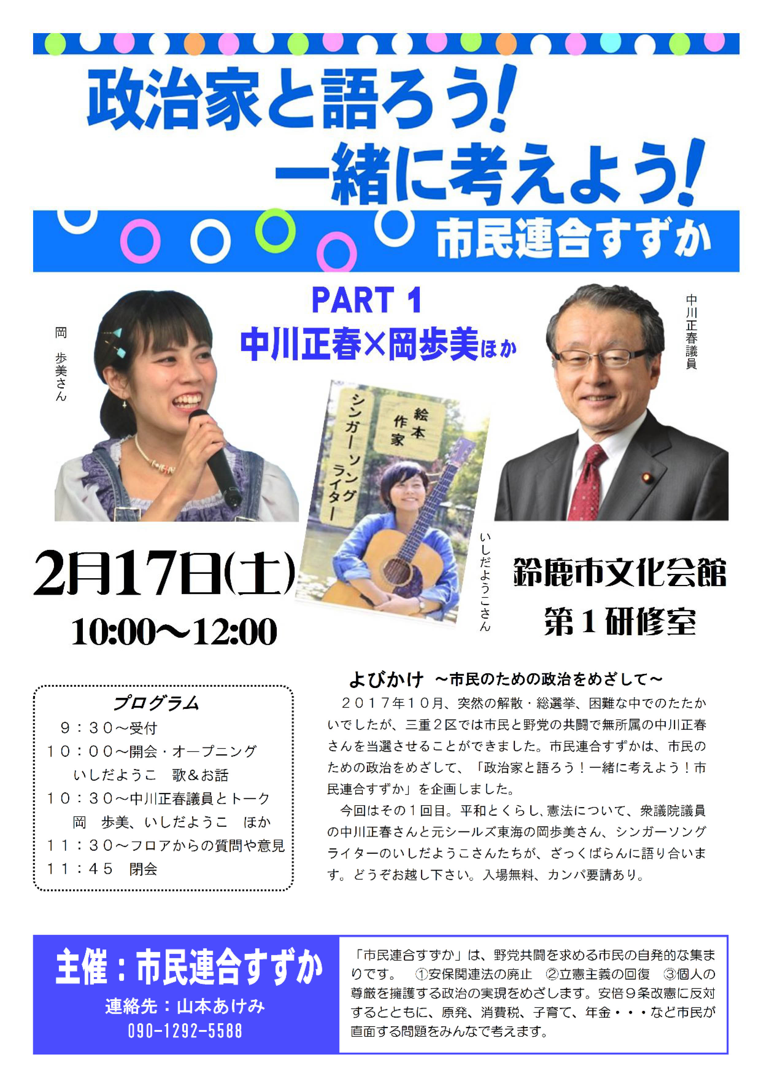2018年1月、2月活動のご案内 寒さに負けない!安倍に負けない!秘密法廃止!共謀罪廃止! モリカケ究明=国家の私物化許さない!=民主主義を育てよう! 憲法改正=戦争できる国づくり許さない!=平和が一番! ■宣伝活動・毎月6日行動 ・1月6日(土)17時から40分間 白子駅西付近 ・2月6日(火)17時から40分間 白子駅西付近 内容:チラシ配り、シール投票、署名、スタンディングなど ■市民連合すずかトーク集会 「政治家と語ろう!一緒に考えよう!市民連合すずか」 パート1:ゲスト・中川正春、岡歩美、いしだようこ、他 2月17日(土)10時~ 鈴鹿文化会館2階第1研修室 ■弁護士さんと話そうカフェ 3月17日(土) 予定 PR