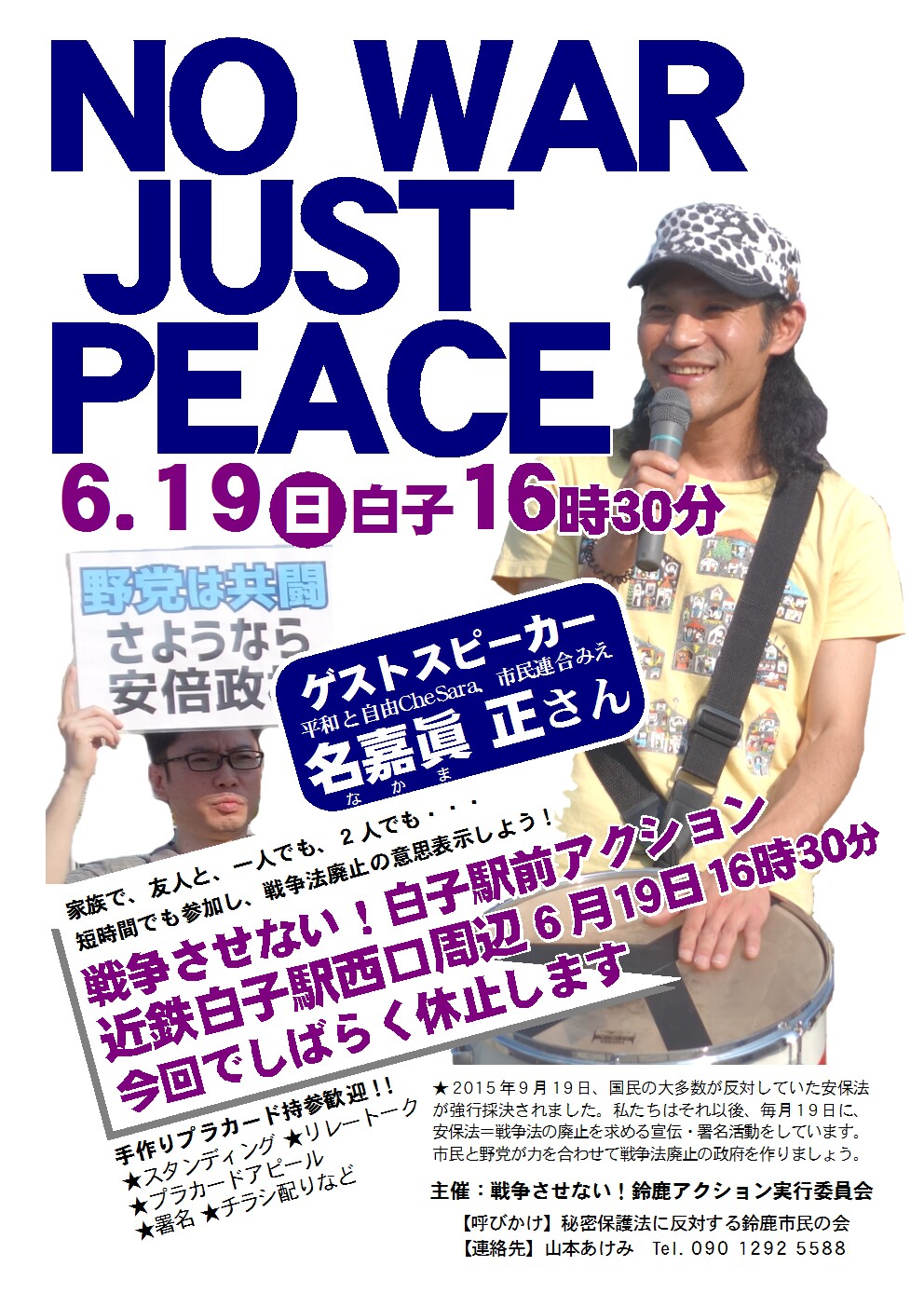 2016年6月活動のご案内 ■澤地久枝さん呼びかけ「アベ政治を許さない」掲示 6月3日(木)13時~10分間、鈴鹿福祉センター西交差点付近 14時~、鈴鹿エース駐車場付近で署名・宣伝活動 ■弁護士と話そうカフェ 日時:6月11日(土)14時~16時 場所:鈴鹿カルチャーステーション(鈴鹿市阿古曽町14−28) テーマ:「複雑な世界情勢と、秘密保護法・戦争法を備えた日本が向かう先は!」 弁護士:村田雄介弁護士(三重合同法律事務所・明日の自由を守る若手弁護士の会) 参加費:無料ですが、お飲み物(300円)のご注文をお願いします。 主催:秘密保護法に反対する鈴鹿市民の会 お問合せ先:山本あけみ 090-1292-5588 ■白子駅前アクション 日時:6月19日(日)16時30分~17時30分 場所:白子駅西口付近 内容:プラカードアピール、署名、チラシ配り、コールなど ★ゲストスピーカー 名嘉眞 正さん(平和と自由CheSara、市民連合みえ) 主催:鈴鹿アクション実行委員会 お問合せ先:山本あけみ 090-1292-5588