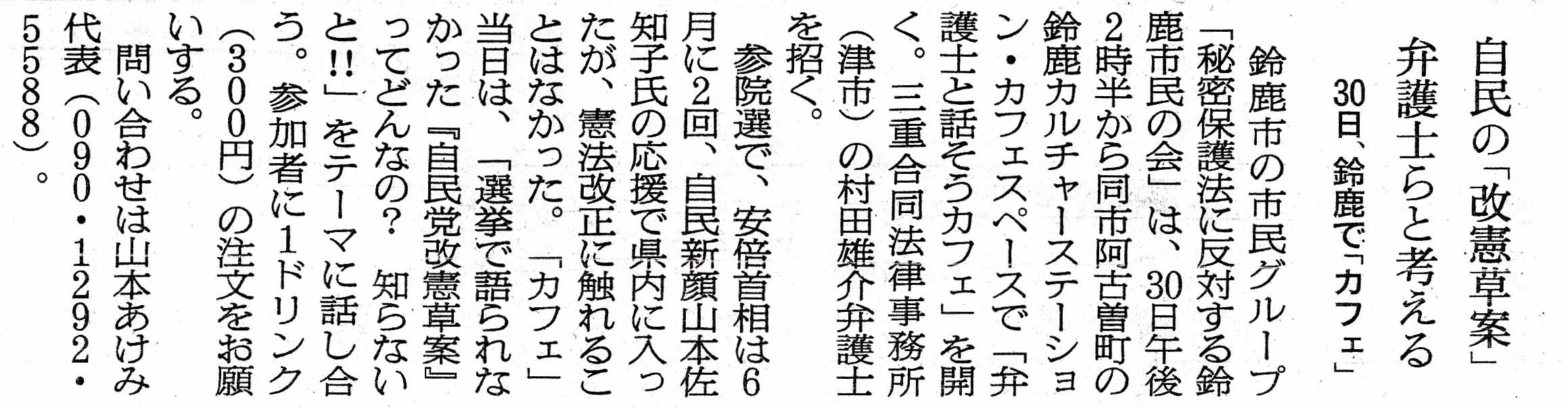 2016年7月活動のご案内 ■弁護士と話そうカフェ 日時:7月30日(土)14時30分~16時30分 場所:鈴鹿カルチャーステーション(鈴鹿市阿古曽町14−28) テーマ:「選挙で語られなかった『自民党改憲草案』ってどんなの?知らないと!!」 弁護士:村田雄介弁護士(三重合同法律事務所・明日の自由を守る若手弁護士の会) 参加費:無料ですが、お飲み物(300円)のご注文をお願いします。 主催:秘密保護法に反対する鈴鹿市民の会 お問合せ先:山本あけみ 090-1292-5588 2016-7-14「朝日新聞」三重版に載りました。