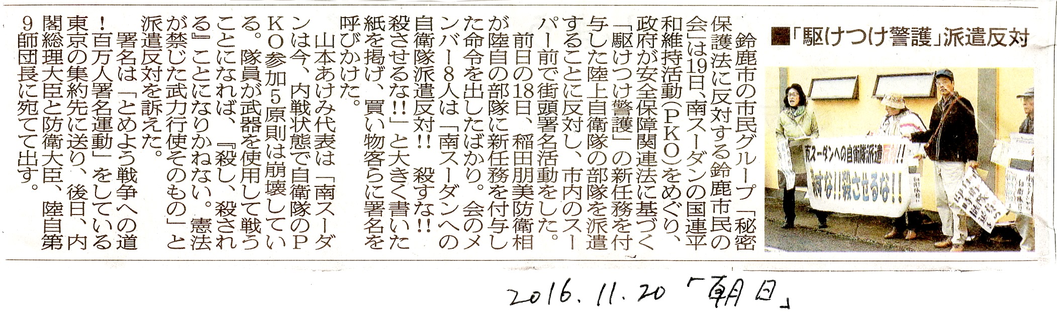 2016年9月活動のご案内 ■弁護士と話そうカフェ <今回のテーマ> 南スーダンでの自衛隊の駆けつけ警護で、自衛隊員の命が危険に?! 日時:9月17日(土)14時30分から 場所:鈴鹿カルチャーステーション 鈴鹿市阿古曽町14-28(電話059-389ー6603) お話:村田雄介 弁護士 (三重合同法律事務所。明日の自由を守る若手弁護士の会) 参加費:無料。飲み物300円御注文を。 参議院選挙の際は、憲法改正は一言も触れず、アベノミクスしか言わなかった安倍政権ですが、南スーダンへ派遣する自衛隊に新しい任務、「駆けつけ警護」や「宿営地の共同防護」が付与されるといわれています。 新たな任務で、武器使用の拡大がなされ、命の危険が大きくなるのではないか。経済・平和研究所(IEP)の世界163カ国の安全度のランクづけは、日本は9番目、南スーダンは162番目です。 平和維持活動(PKO)、安保関連法を弁護士さんから解説していただき、平和・いのちの観点から話しあいたいと思います。 どうぞ多くの方のご参加をお待ちしています。 主催:秘密保護法に反対する鈴鹿市民の会 問い合わせ:山本あけみ(090-1292-5588)